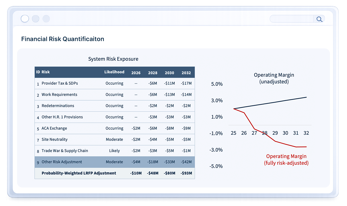 Translate quantified risk directly into financial and strategic plans. Generate baseline and risk-adjusted views instantly as conditions change, so leadership can make informed decisions with current information.