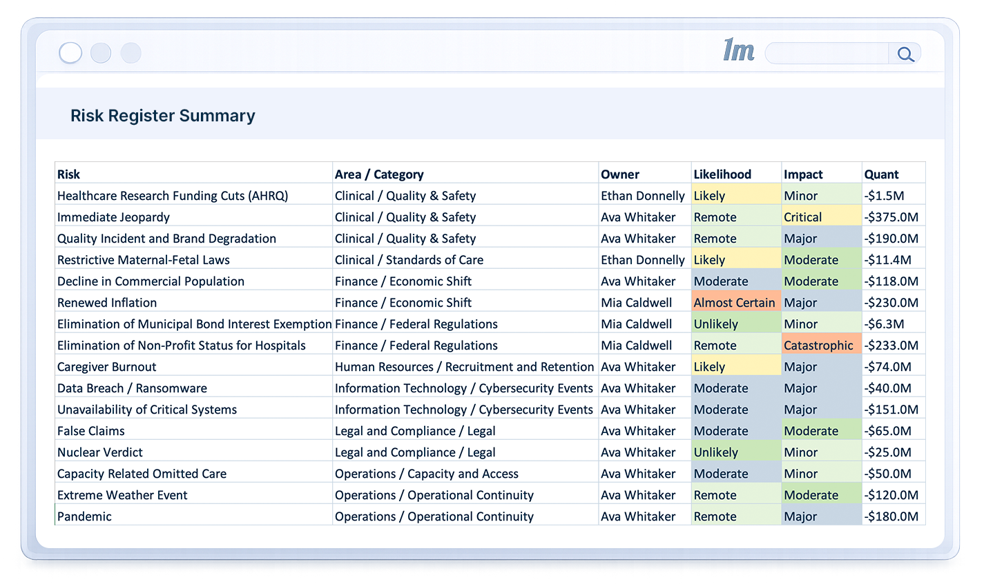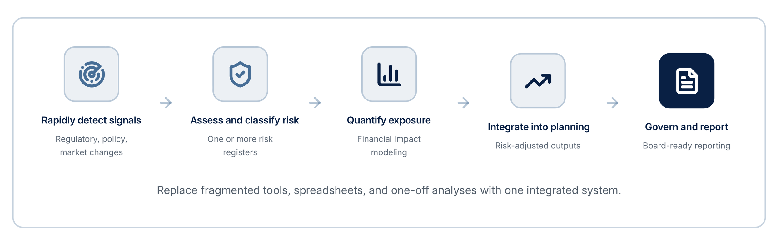 One platform that keeps risks current, quantifies exposure, and supports confident decisions across Finance, Strategy, ERM, and Compliance.